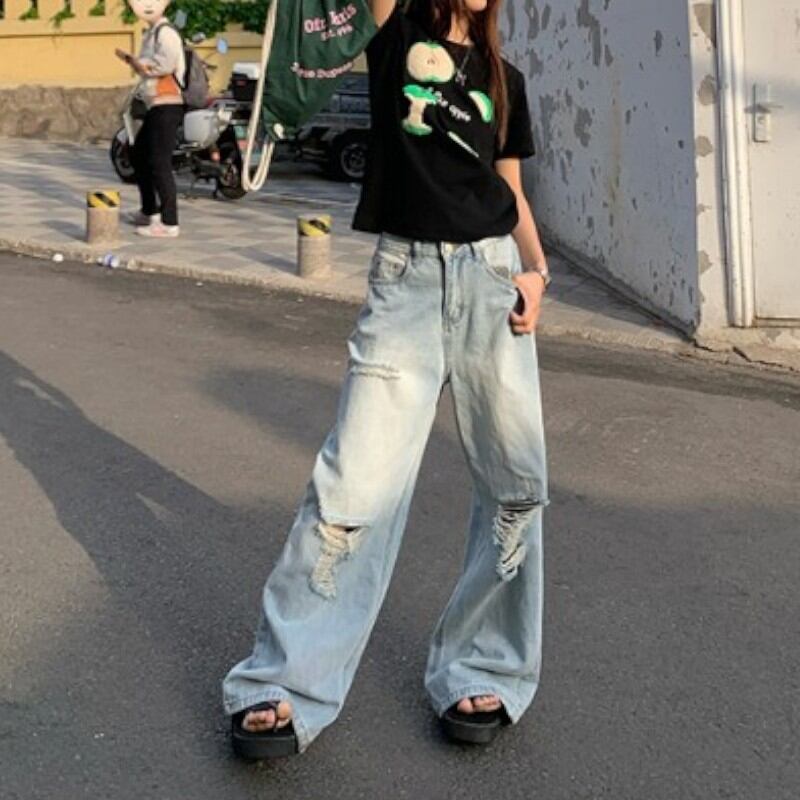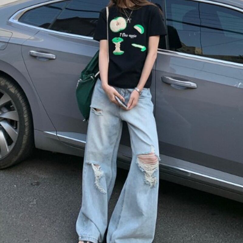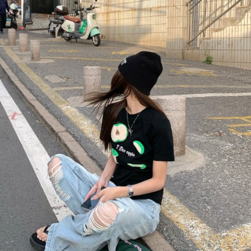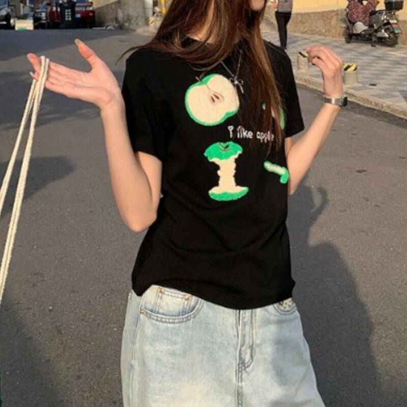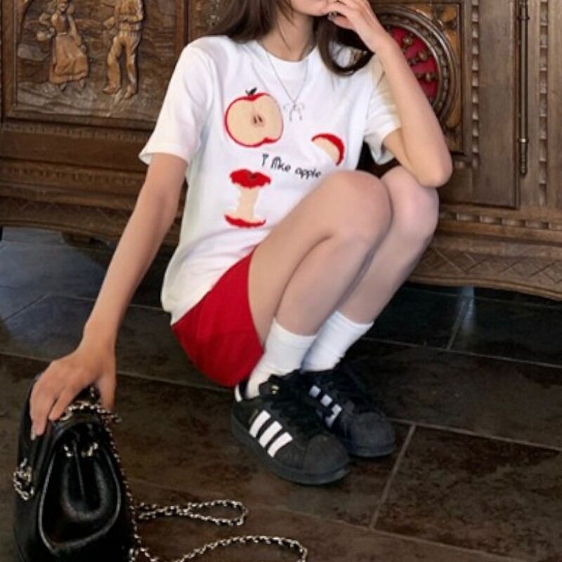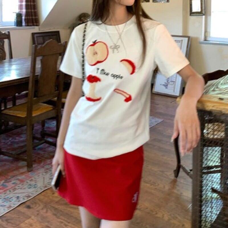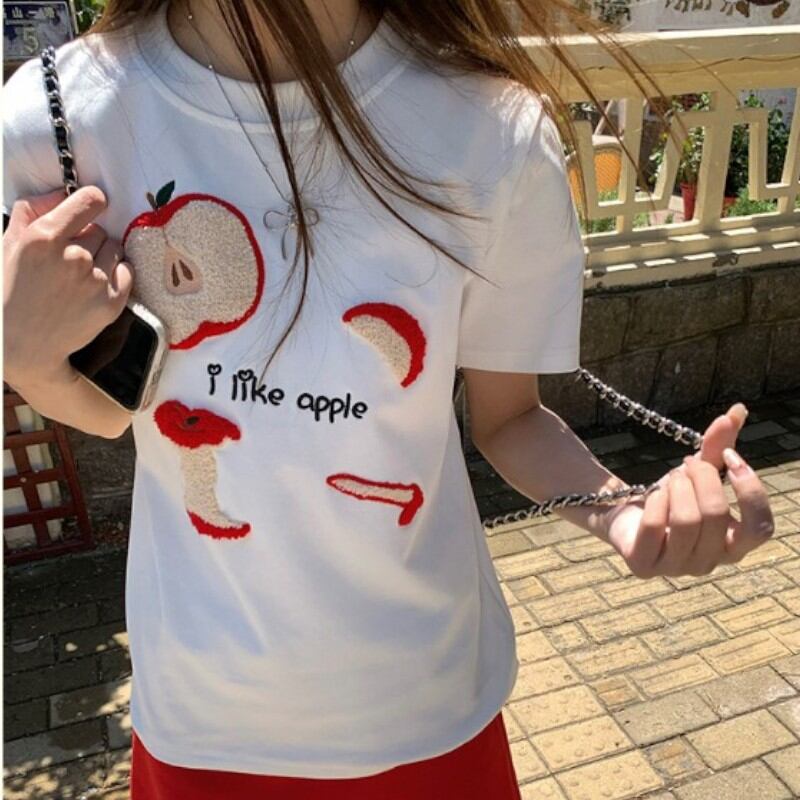 girly lovely apple towel embroidered T-shirt 【2color】0970