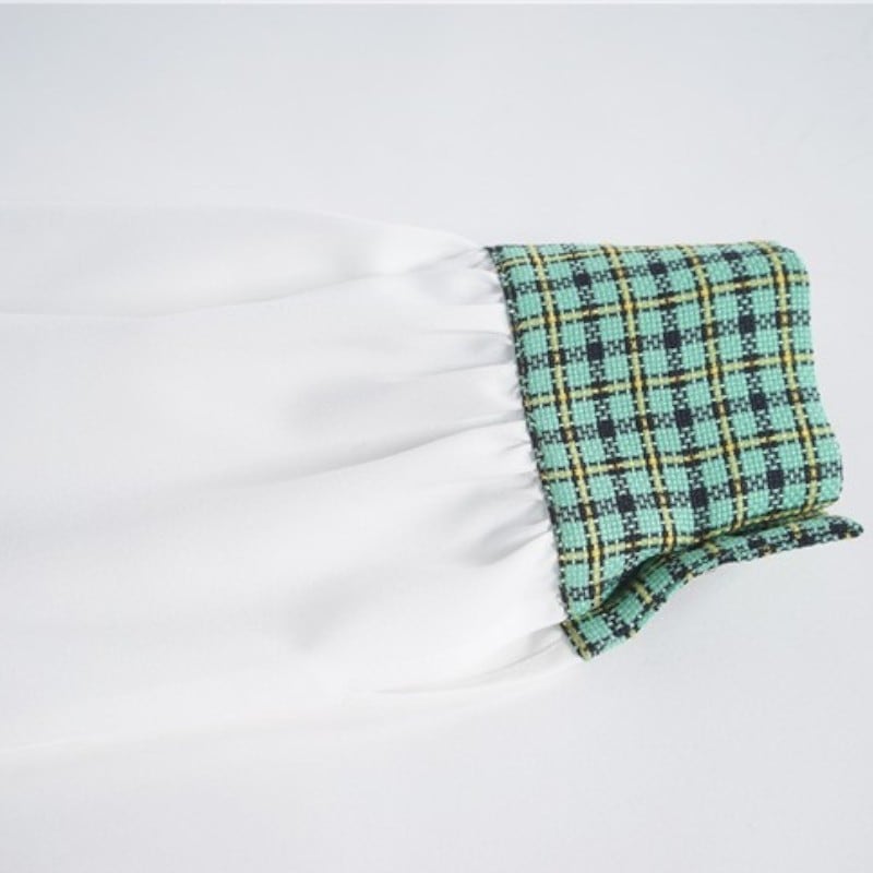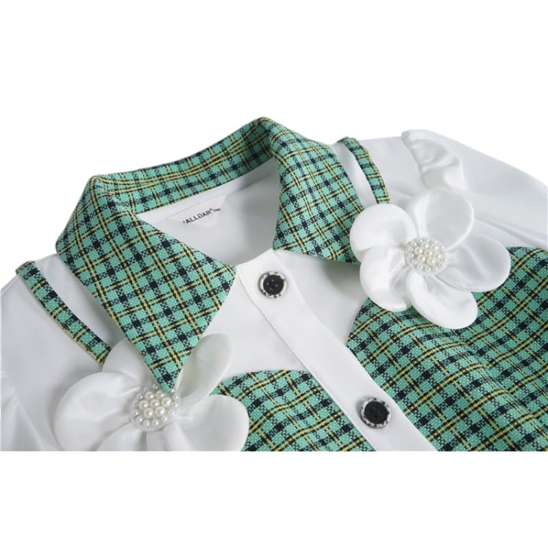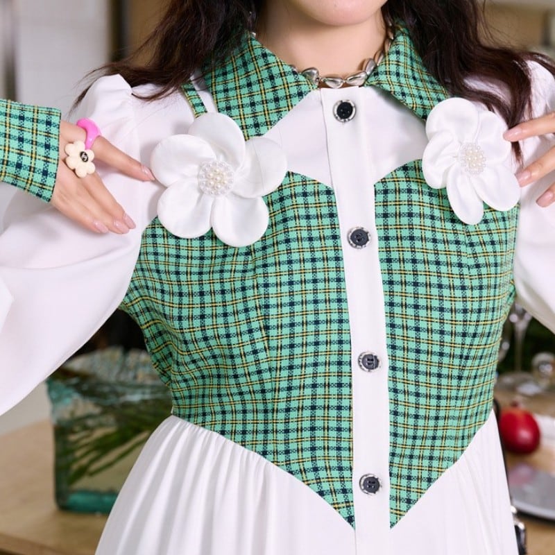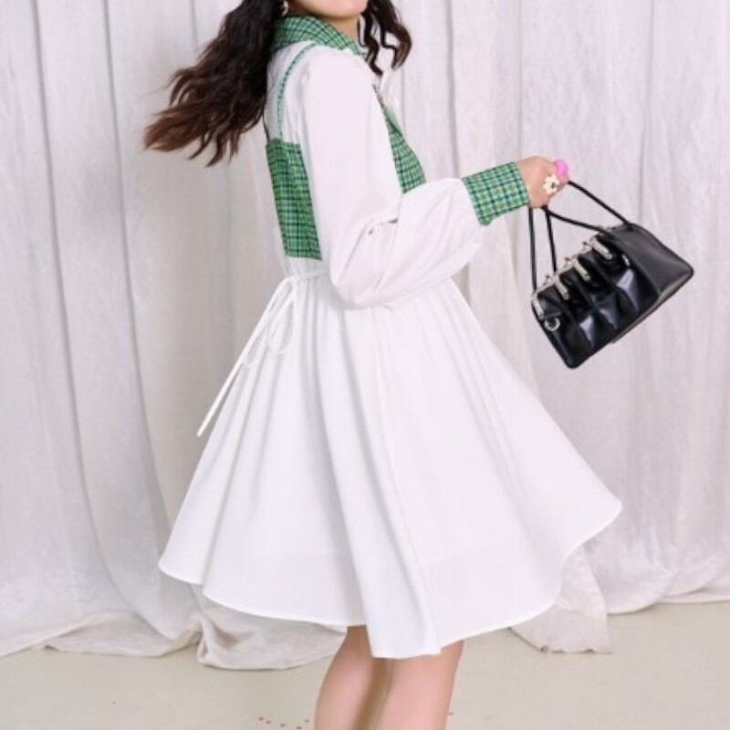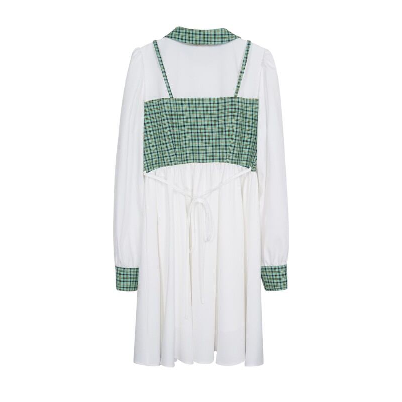 retro girly green plaid suspenders fake two-piece white shirt dress 0976
