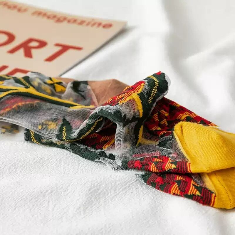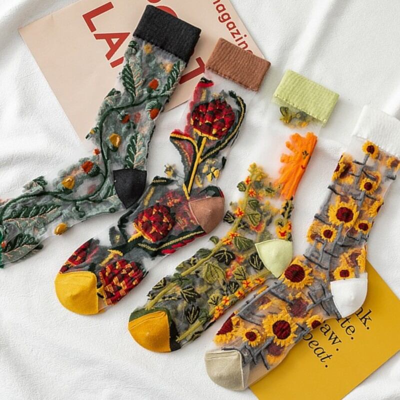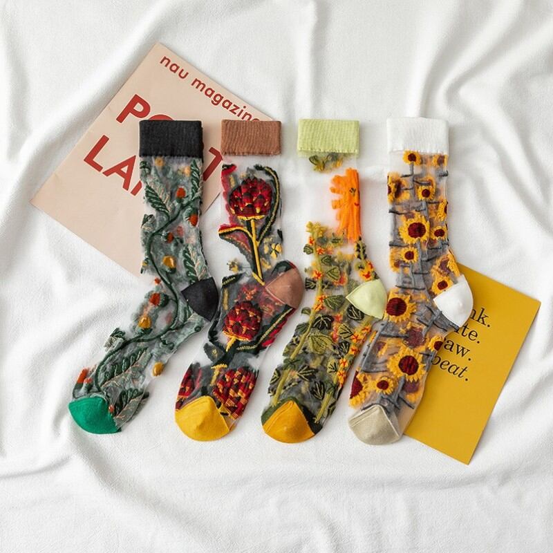 繊細な花柄の刺繍が施された4足セットのメッシュソックス。