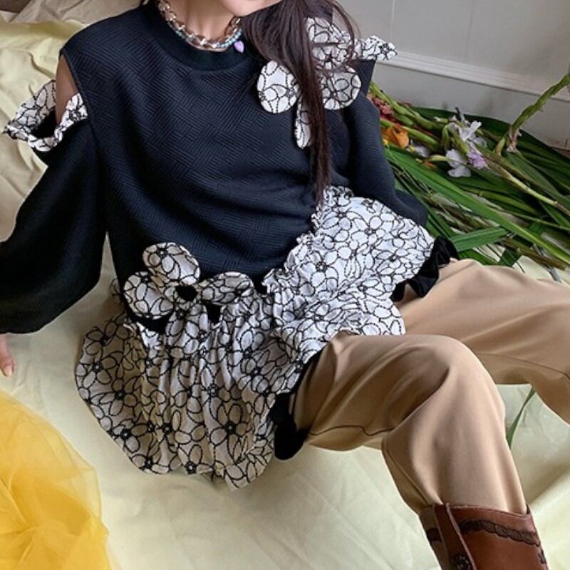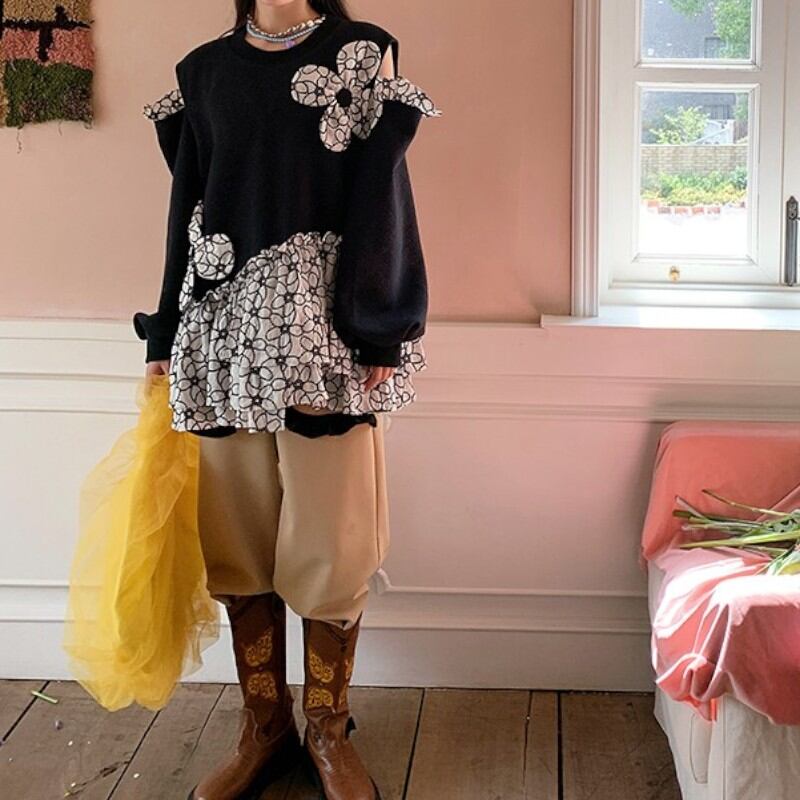 キュートな大きな花と花柄、オフショルダーの個性的なデザインのプルオーバーブラウス✨