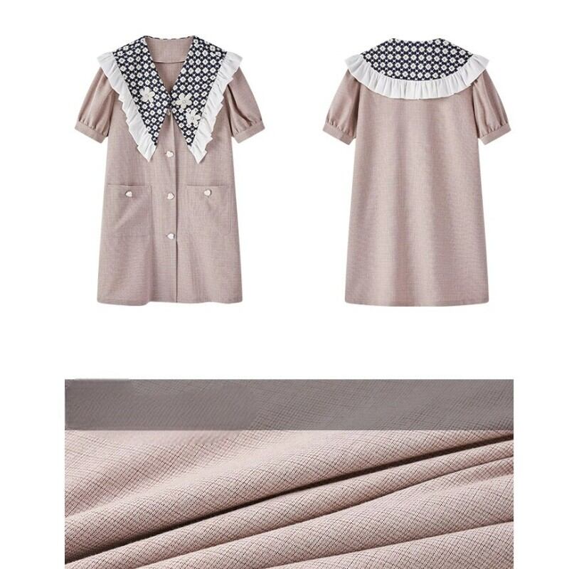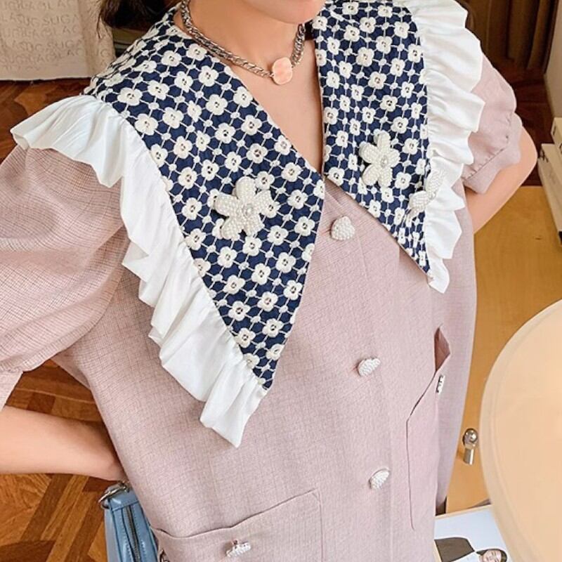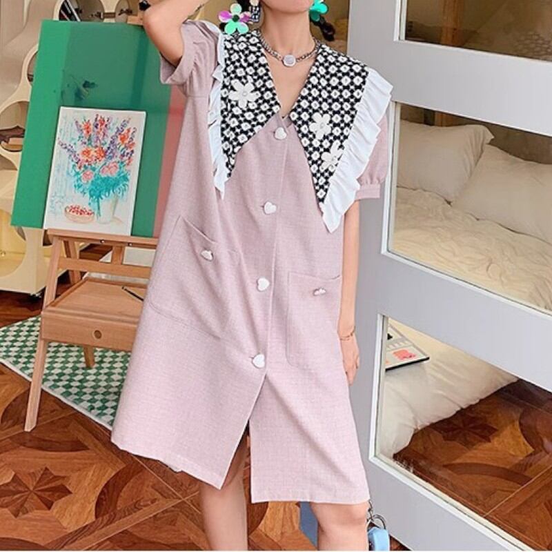 girly cute smoke pink embroidery flower large collar shirt dress 0995
